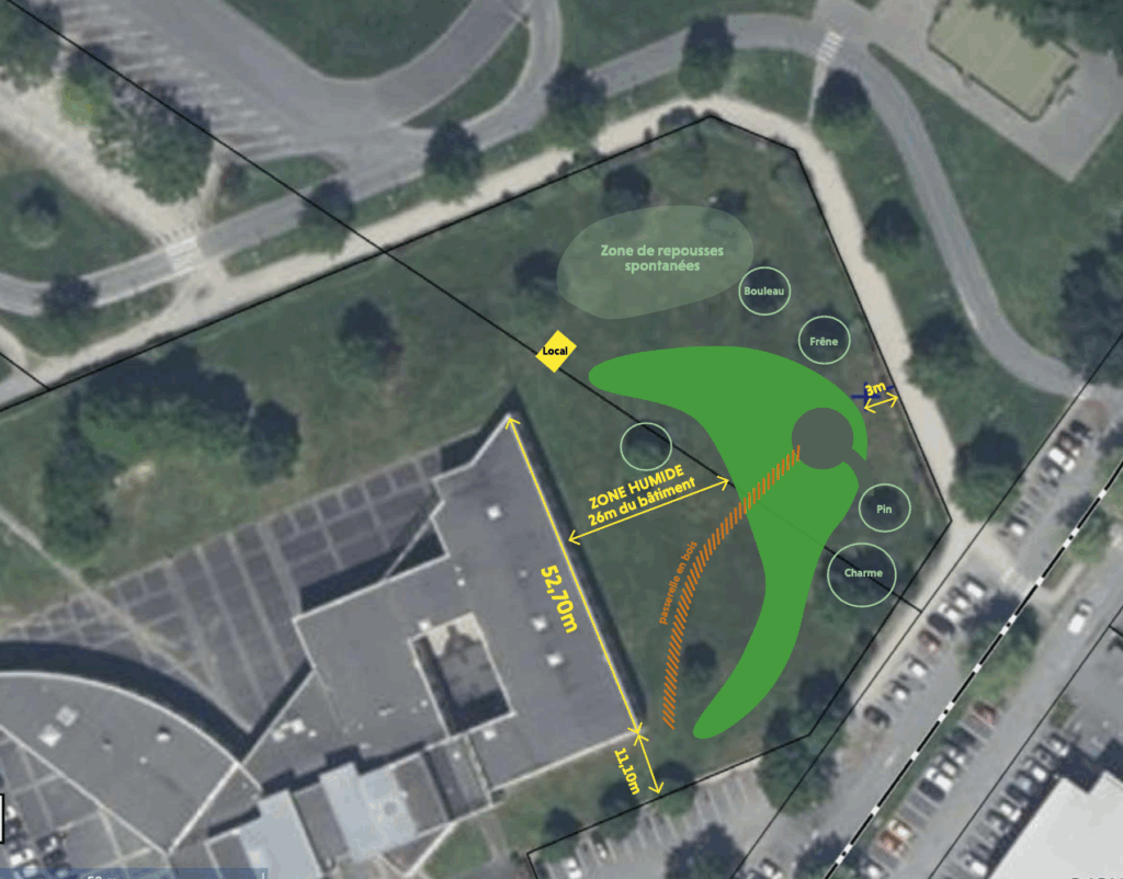 Située sur une parcelle de 4500 m2 jouxtant le lycée, le terrain où a été plantée la mini-forêt était jusqu’à présent une pelouse entretenue de façon différenciée. De nombreux îlots de repousses spontanées de frênes, cornouillers sanguins et chênes y ont donc été naturellement préservés. Le sol étant particulièrement pauvre en phosphore et potassium, une attention particulière a été portée à l’apport d’amendements organiques afin de garantir une bonne reprise des jeunes plants forestiers. La mini-forêt deviendra très vite un habitat pour les insectes et l’avifaune de la ville. Elle participera également à l’atténuation des îlots de chaleur en milieu urbain.
